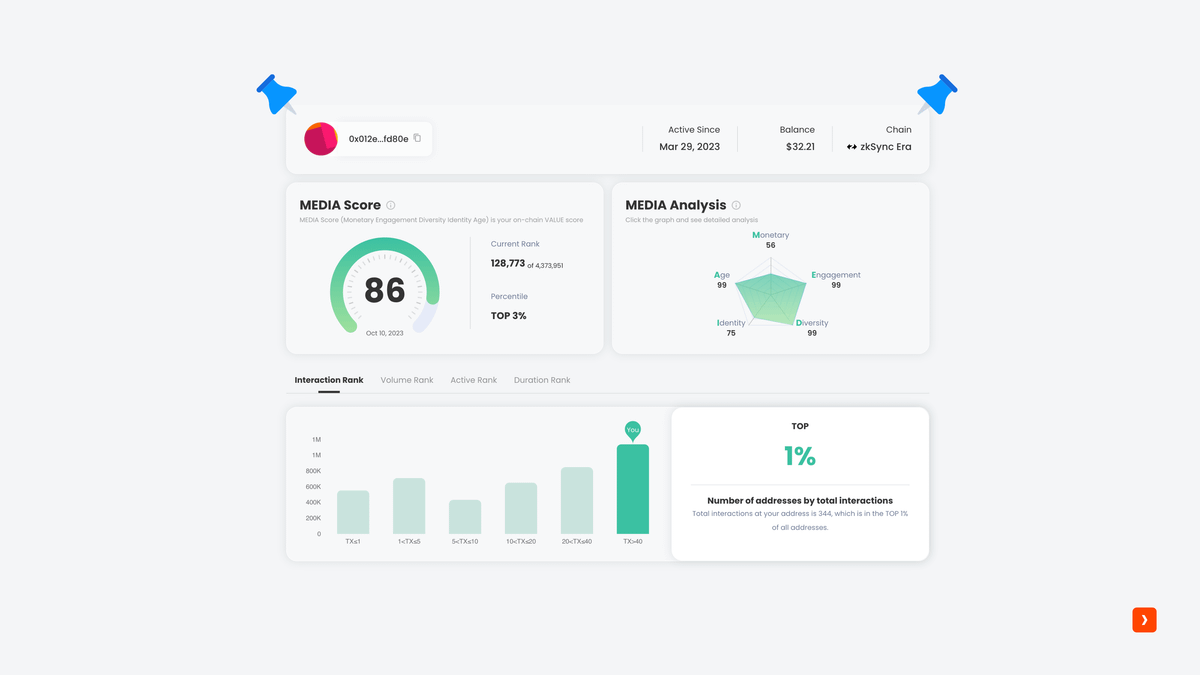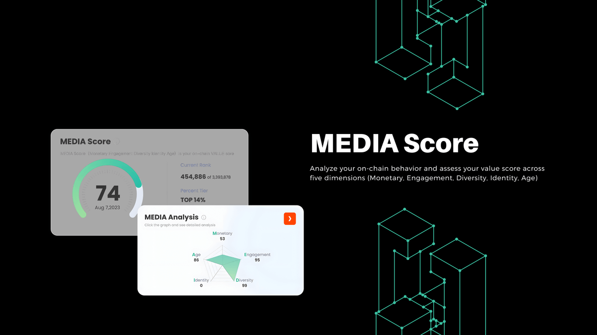 MEDIA Score is an on-chain user value measurement within a range of 0-100 points. It aggregates a user's on-chain behavior across five dimensions where M.E.D.I.A. Stands for Monetary, Engagement, Diversity, Identity, and Age respectively.