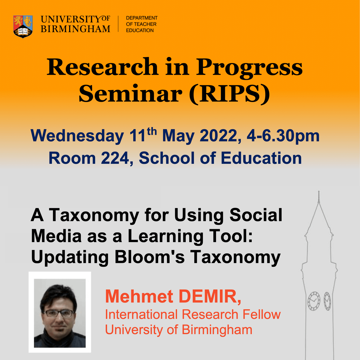 On Wed 11th May Dr Mehmet DEMIR, International Research Fellow University of Birmingham will be giving a Research In Progress on A Taxonomy for Using Social Media as a Learning Tool: Updating Bloom's Taxonomy...