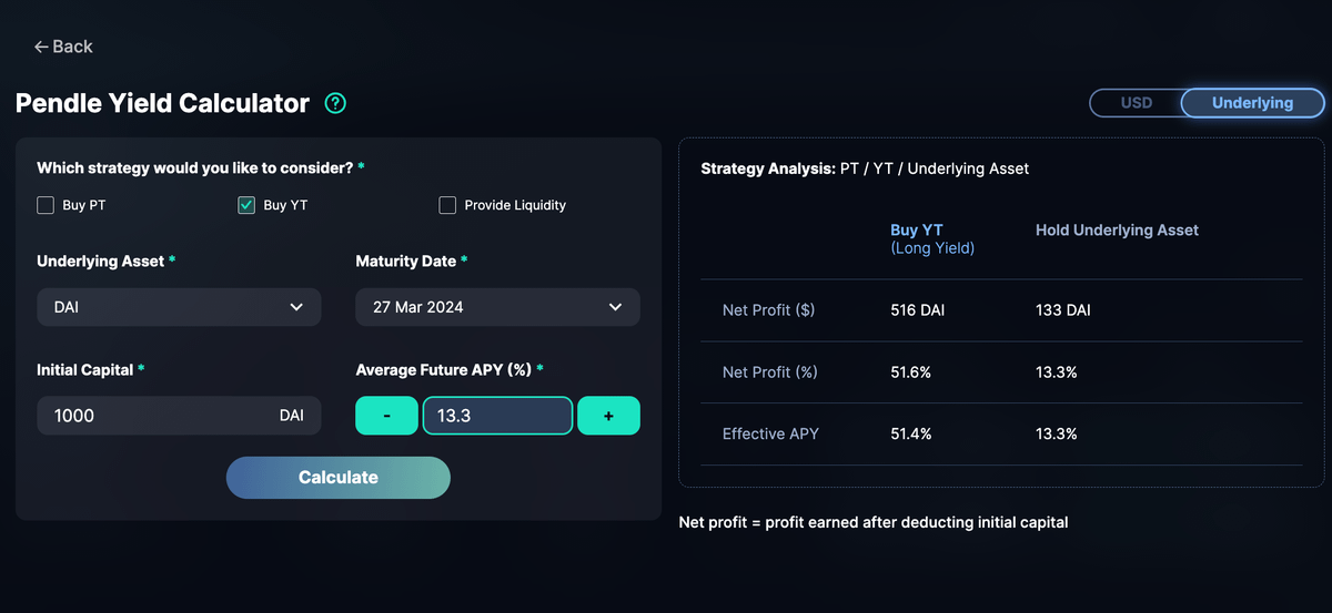 自己也要給上一些對未來的看法 例如你相信未來 GLP perp交易量仍然穩定/看好嗎?🧐 記住,YT = 看多未來生息表現、 PT = 看空未來生息表現 我自己的看法,gDAI的YT,implied APY在9%以下的話,開始值得考慮 🤫 別忘了Pendle提供了計算機 可以模擬底層資產未來不同生息能力下、你的實際投資回報!