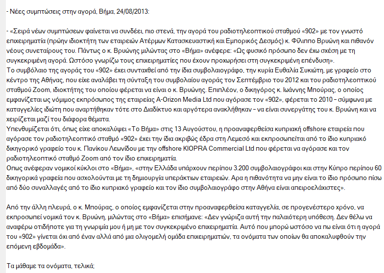 Θέτει κάποια εύλογα ερωτήματα για αυτή την πώληση όπως πχ. πως η εταιρεία του Κουρτάκη με ζημιά κοντα στα 900.000 € το 2012 κατάφερε να δώσει το ίδιο ποσό για την αγορά του ραδιοφωνικου 902.