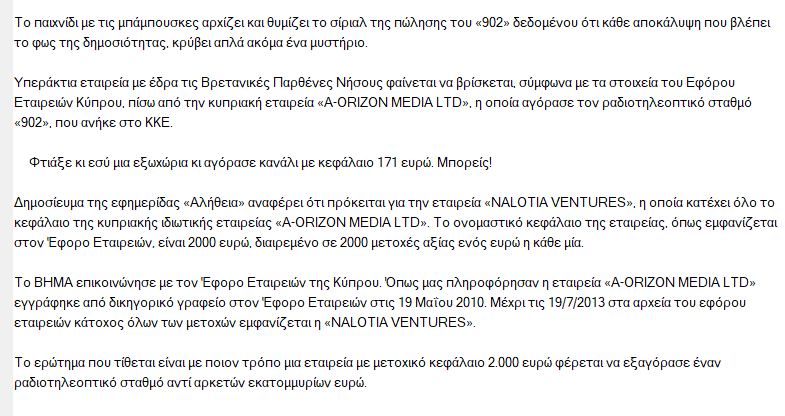 Το καλοκαίρι του 2013 μάθαμε μέσω του τύπου, ότι το ΚΚΕ πούλησε τον ‘902 ΤV’ και την συχνότητα του ραδιοφώνου ‘902 αριστερα στα FM’, ουσιαστικά την εταιρεία του ΚΚΕ ‘Ραδιοτηλεοπτική ΑΕ’ σε μία κυπριακή off shore. Μία μεταβίβαση η οποία προκάλεσε πλήθος αντιδράσεων.