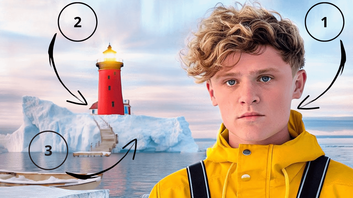 While bright and bold colours are given to the lighthouse and the coat, the ice is given a desaturated blue