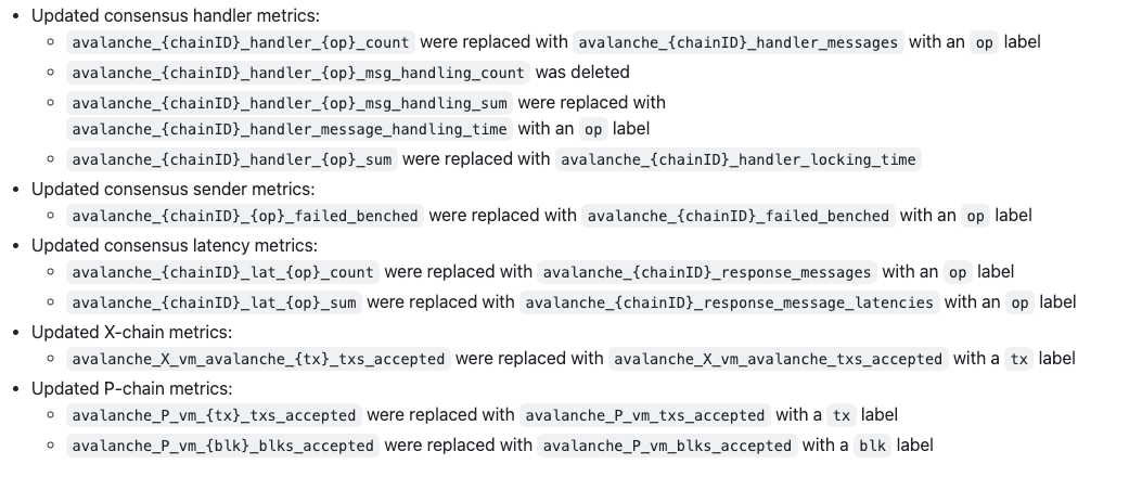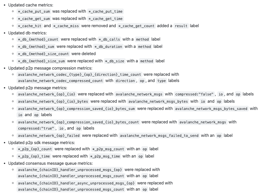 Durango 6 overhauls the format of many of AvalancheGo's exported metrics. This new format is easier to work with when creating dashboards and cheaper for hosted metrics platforms to ingest.