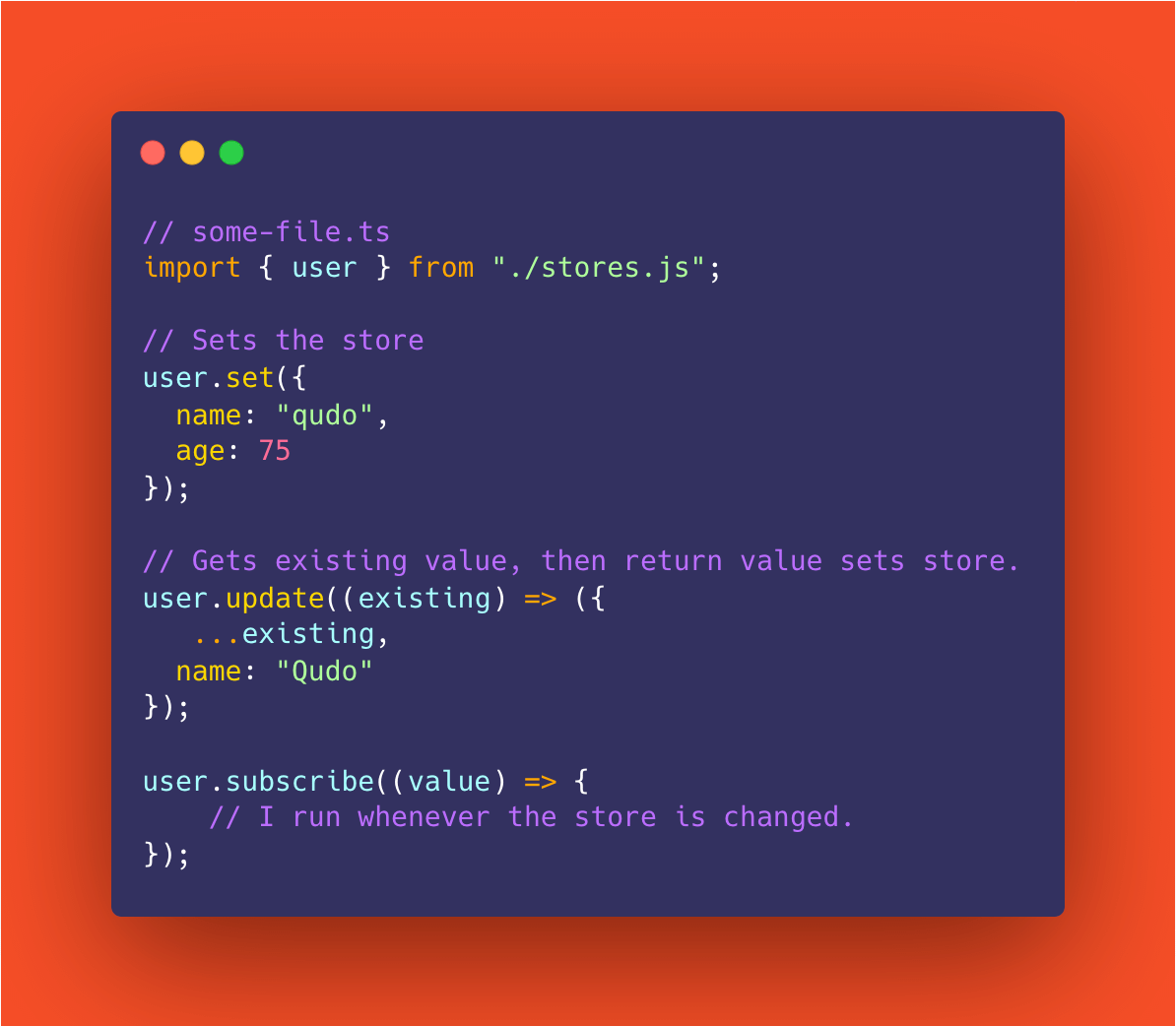 See that subscribe method at the bottom? This pattern of a .subscribe() method that takes a callback that gets the value as the first arg isn't unique to Svelte and often used in subscription models. Svelte adheres to these standards