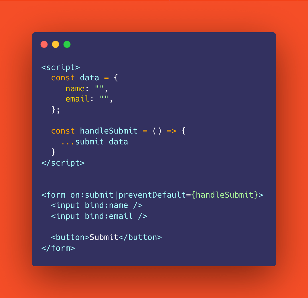 A lot of times in UI dev, we need to capture data from the user. Here's an example of a .svelte file that binds the input value to state. In Svelte, things defined in the script tag are accessible in the template using {curly brackets}. You can also put any JS expression in {}s