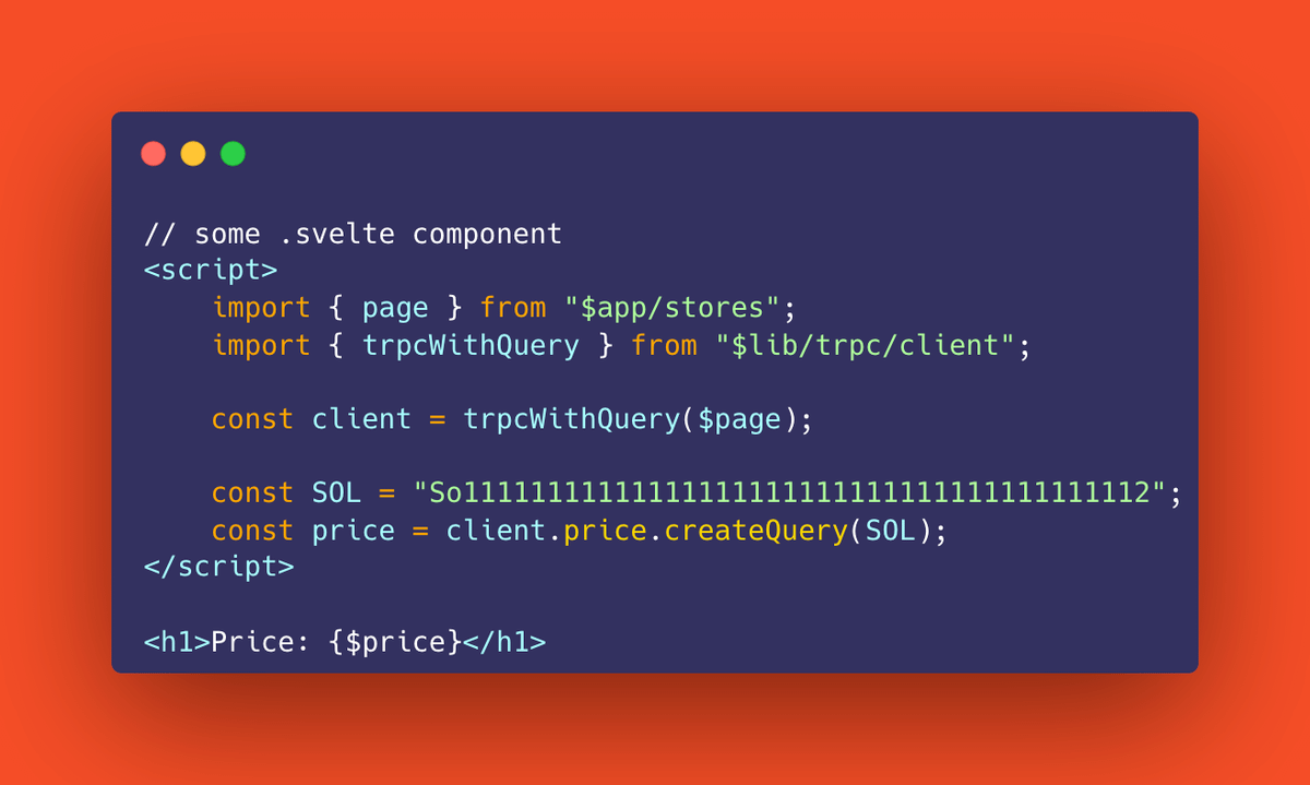The above is an example of a get price endpoint and how you could use it in Svelte with this setup, so clean! When you subscribe to that query store it will fetch data if it doesn't have it or reuse existing if it does. you can also query.load() to manually refetch at any time.