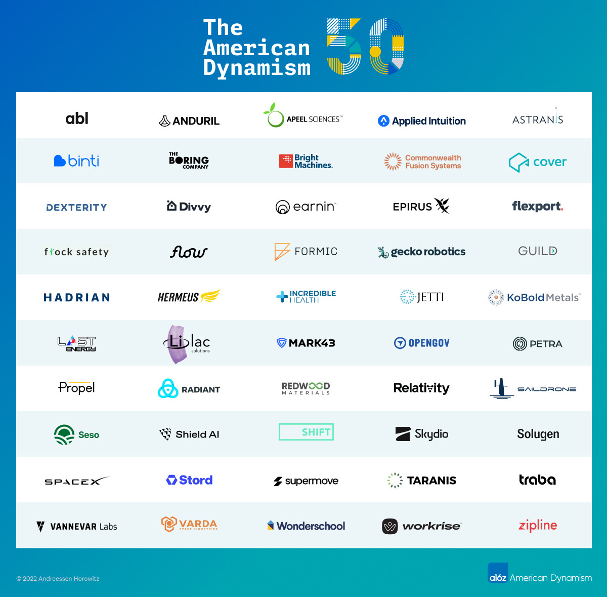 These startups are tackling some of the nation's most pressing challenges β and pioneering new technologies in the process: a16z.com/american-dynamism-50/