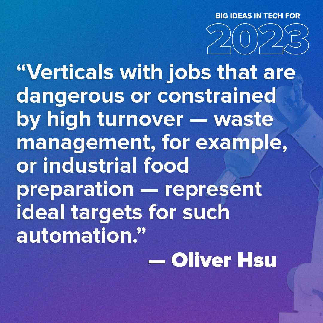 In 2023, @oyhsu thinks we're likely to see robotics companies develop automation solutions for specific verticals โ and scale to service multiple use cases within these industries โ rather than performing a particular task across sectors.