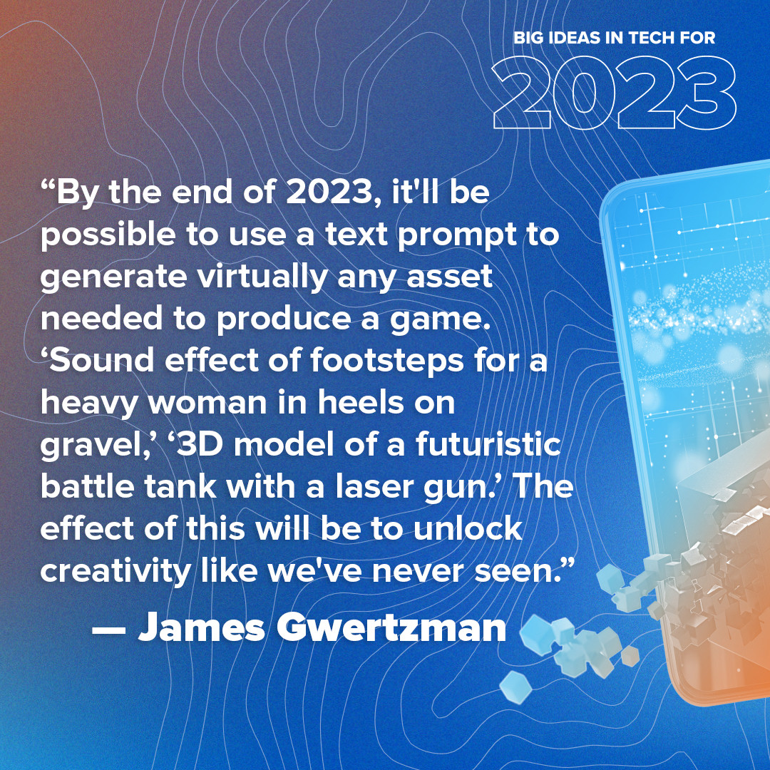 General Partner @gwertz thinks the biggest revolution to hit gaming in 2023 will be the creation of production-ready generative AI models for all the asset types that are needed to produce a modern game.
