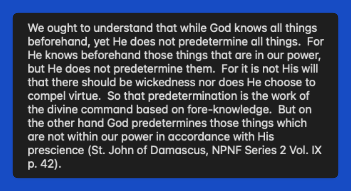 St. John of Damascus and St. Gregory Palamas wrote that God does *not* predetermine things, rather He foreknows and thus foreordains. If God's will is predetermined, this diminishes the hypostatic nature of Christ' human will, so He would only have a divine will (Monothelitism).