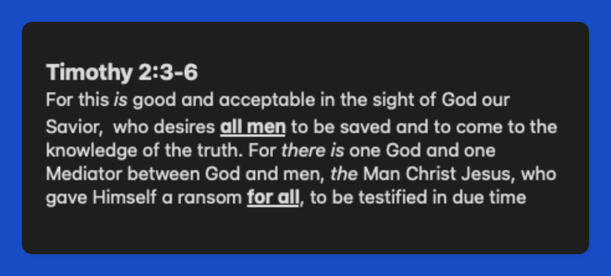 L: "Limited atonement" asserts that Christ only died for the elect and not all men. Aside from the ignorance of Christus Victor and emphasis on a penal substitutionary atonement, the Calvinist must impose limitation into the Biblical text so "for all" means "for all the elect".