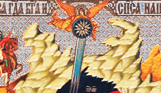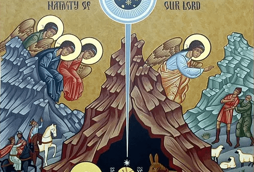 Depicted on the left are the magi on their journey following the star in the sky. On the right, the Angels appear in the heavens and proclaim the Saviour's birth to the shepherds in the field so they can visit the town of Bethlehem and witness the Incarnate Christ.