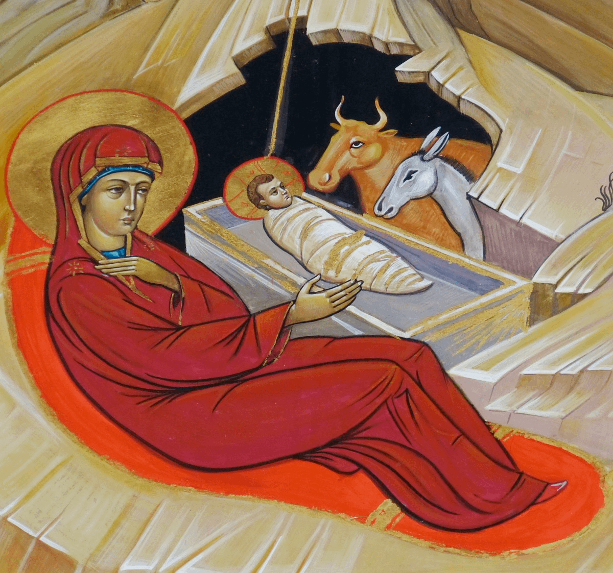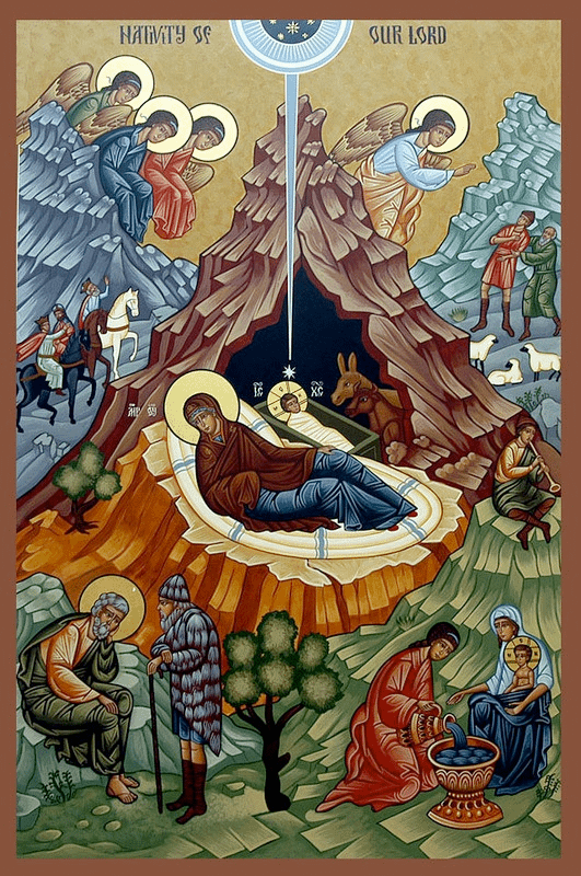 Christ being born in a cave is actually an ancient tradition and is not found in Biblical texts. In this depiction He is dressed in burial clothes which foreshadows His death. His location in a cave also is a foreshadowing of the grave where He would be buried and resurrected.