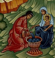 The women on the bottom right are midwives holding the Christ-child, indicating that our Lord was born as truly man and did not simply appear as human like the Gnostics claimed. The fountain also indicates that Christ was washed after a normal, messy birth.
