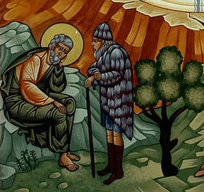 In most cases, the Theotokos is gazing at the Christ-child, instead here she is looking at St Joseph the Betrothed while interceding for him. The old man depicted next to Joseph is the devil who is filling his mind with doubt and anger. He has a halo, indicating his holiness.