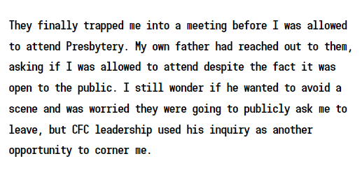 I was seated between my parents on a stage for hundreds of people to stare at me. I was 17 and I felt sick to my stomach. This was my presbytery experience. #cfctoo