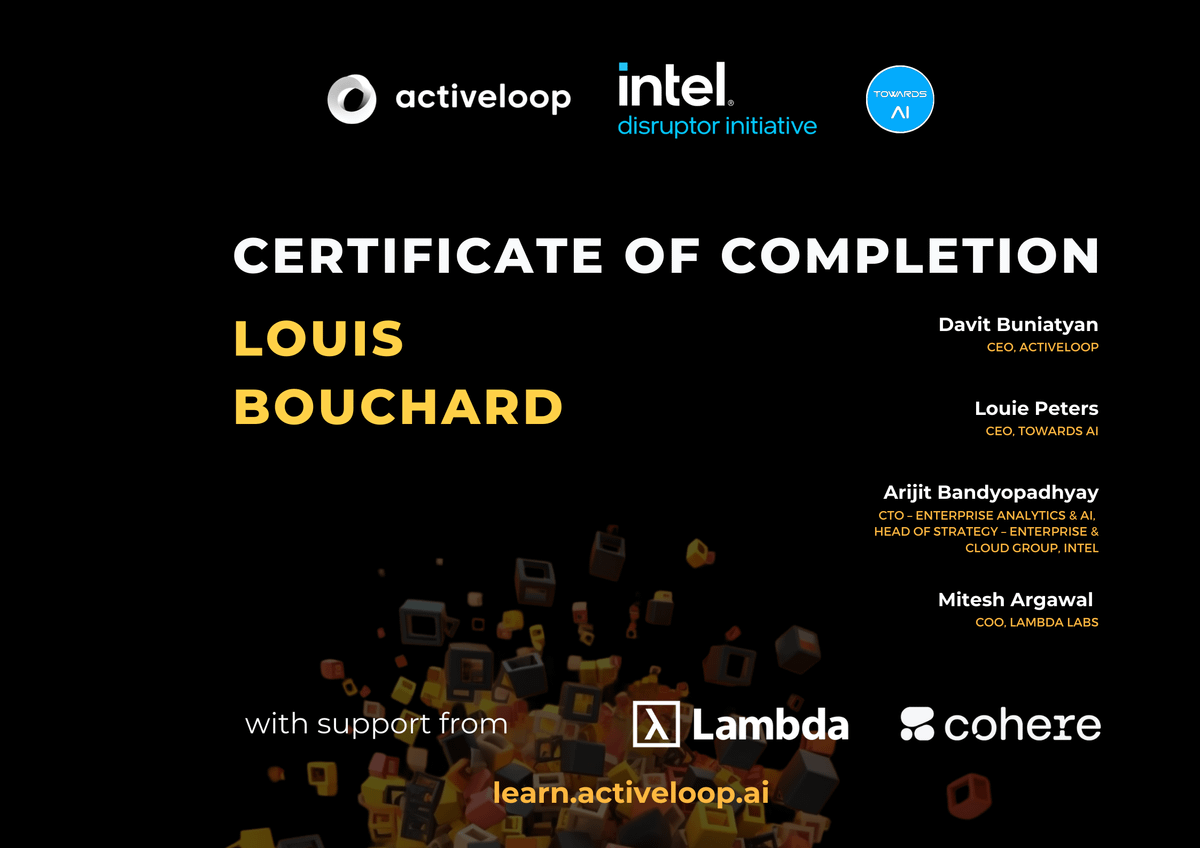 Exciting News: We're Launching a Free Course on Training & Fine-Tuning Large Language Models (LLMs) for Production in collaboration with @activeloop and @intel Disruptor! This course was also created with invaluable support from our friends @cohere, @LambdaAPI, & @wandb.