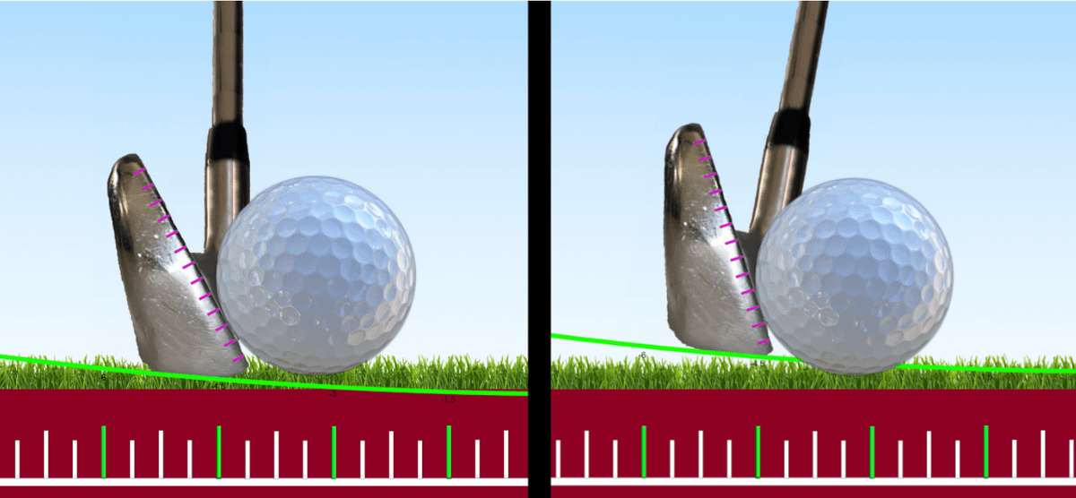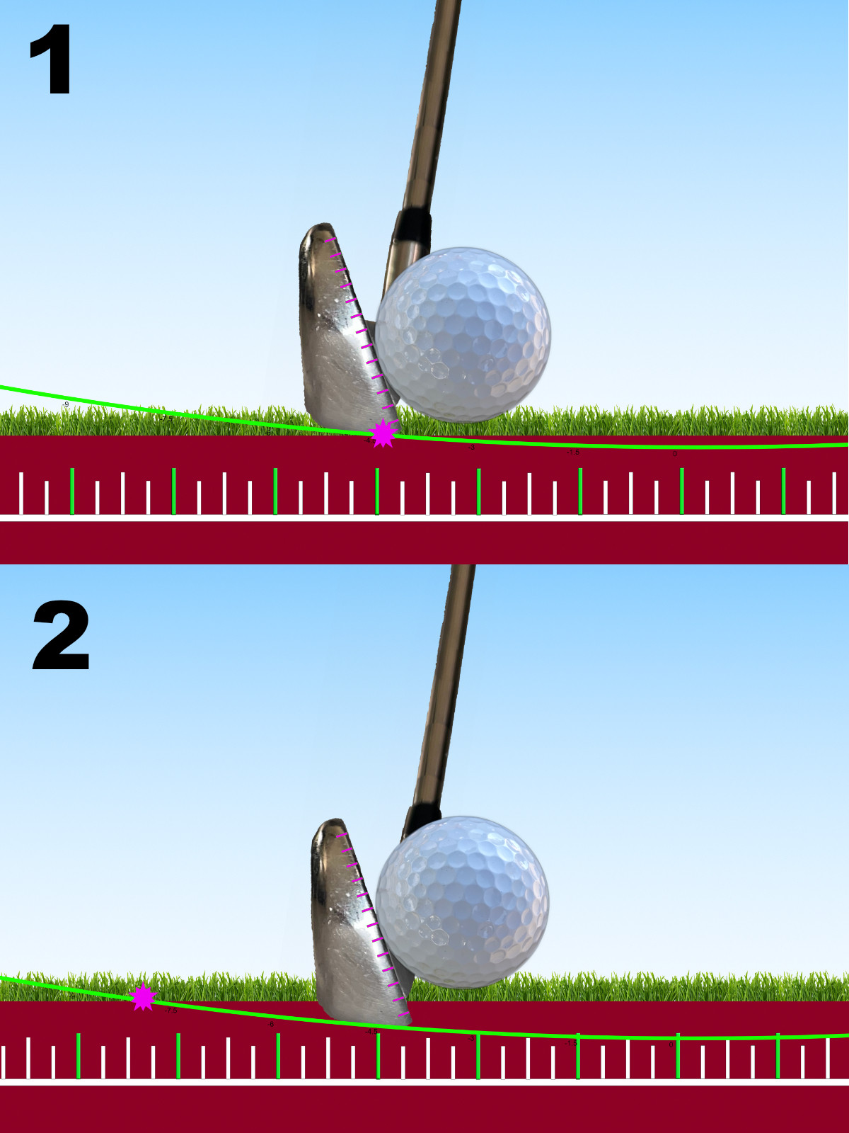 EXAMPLE - with forward shaft lean (right), the club can hit the 3rd groove on the face while swinging HIGHER from the ground (see the green arc).
