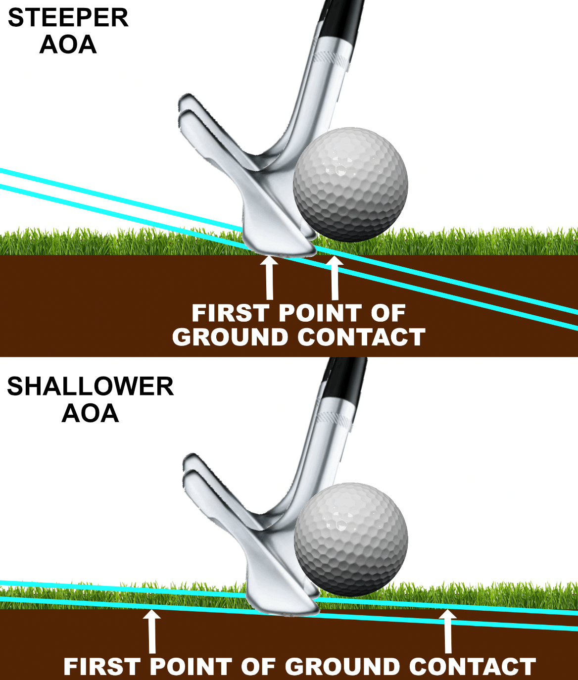 With a steeper attack angle (AOA), any drop in vertical height (arc depth) results in less ground contact variance than with a shallower AOA.