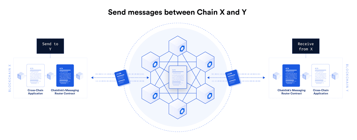"A smart contract from source chain invokes Chainlink's Messaging Router, which will leverage Chainlink DONs to securely send the message to the destination chain, where another Messaging Router validates it and sends it to the destination smart contract."