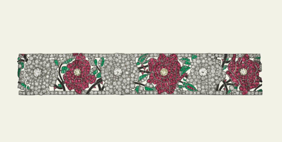 The piece was a roses bracelet set with rubies, emeralds and diamonds.