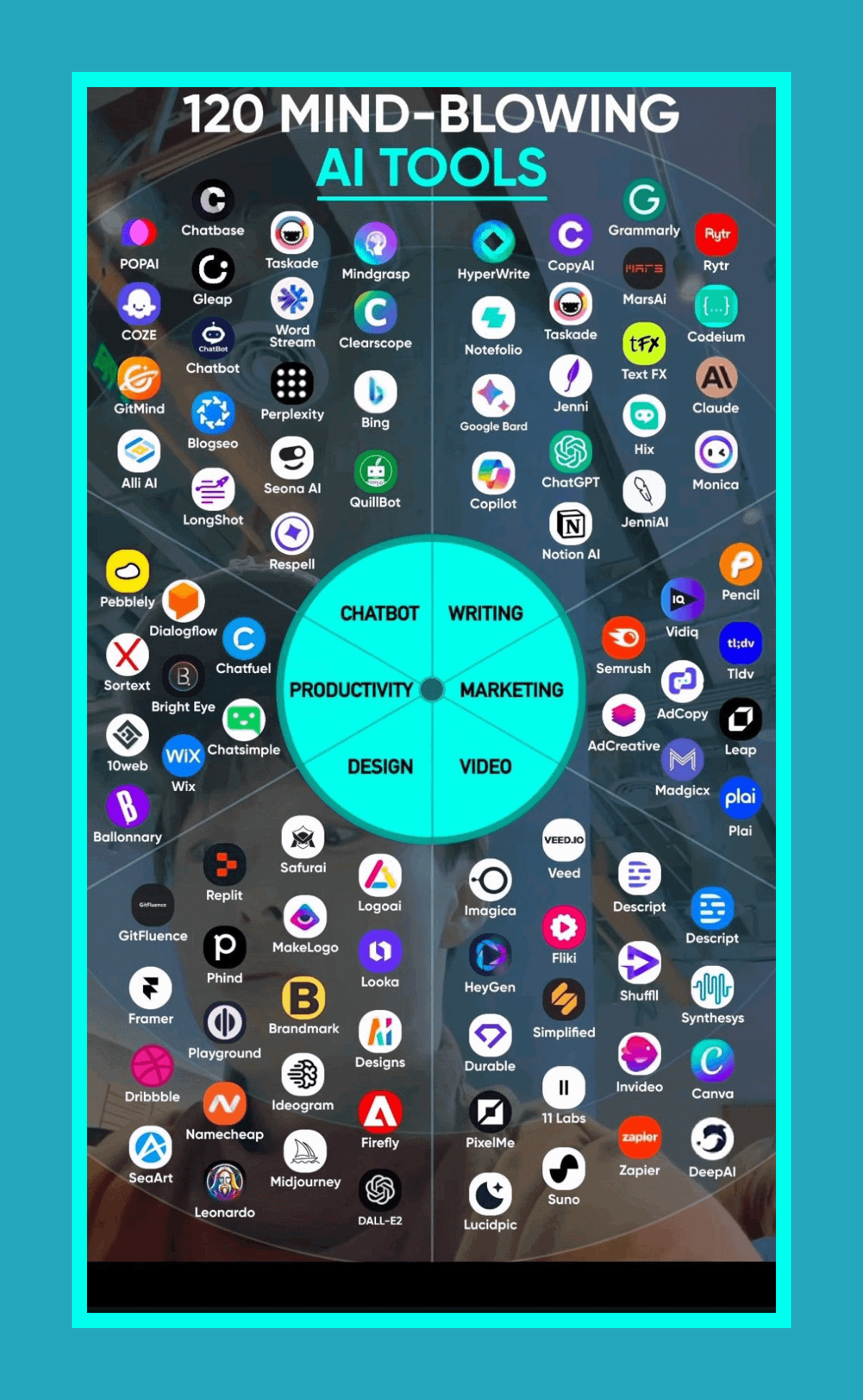 𝟏𝟎𝟎+ 𝐌𝐢𝐧𝐝-𝐁𝐥𝐨𝐰𝐢𝐧𝐠 𝐀𝐈 𝐓𝐨𝐨𝐥𝐬: 1. Ideas - YOU - Claude - ChatGPT - Perplexity - Bing Chat 2. Twitter - Typefully - Postwise - Metricool - Tribescaler - TweetHunter 3. Presentation - Prezi - Pitch - PopAi - Slides AI - Slidebean 4. Website - Dora - Wegic - 10Web - Framer - Durable 5. Writing - Rytr - Jasper - Copy AI - Textblaze - Sudowrite - Writesonic 6. AI Model - RenderNet - Glambase App 7. Meeting - Tldv - Krisp - Otter - Avoma - Fireflies 8. Chatbot - Poe - Claude - Gemini - ChatGPT - HuggingChat 9. Automation - ClickUp - Drift - Outreach - Emplifi - Phrasee 10. UI/UX - Uizard - Visily - Khroma - Galileo AI - VisualEyes 11. Image - Stylar - Freepik - Phygital+ - StockIMG - Bing create 12. Video - Pictory - HeyGen - Nullface - Decohere - Synthesia 13. Design - Looka - Clipdrop - Autodraw - Vance AI - Designs AI 14. Marketing - AdCopy - Predis AI - Howler AI - Bardeen AI - AdCreative If useful This tools Repost to share your audience.