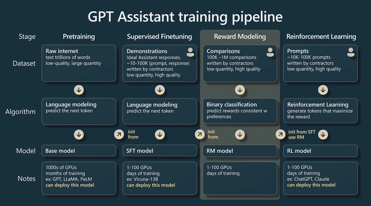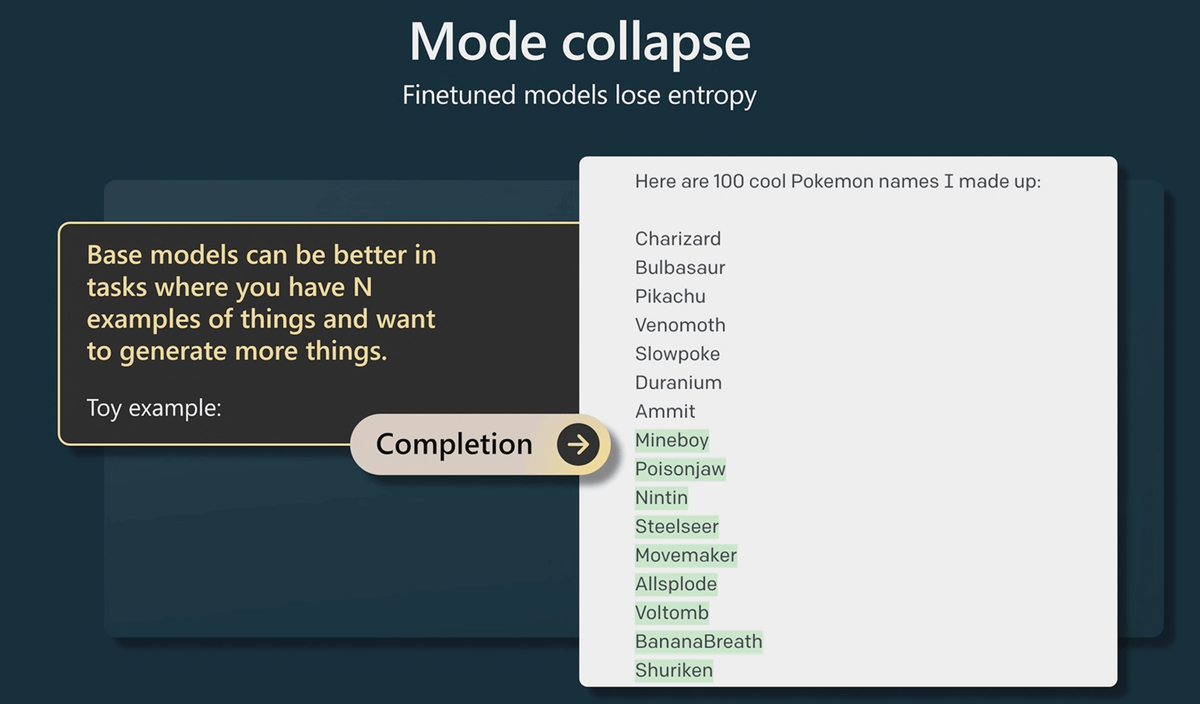 Interestingly, Andrej talks about RLHF are not strictly improvements on base models. RLHF models have less enthropy so it is less "inventive" potentially.