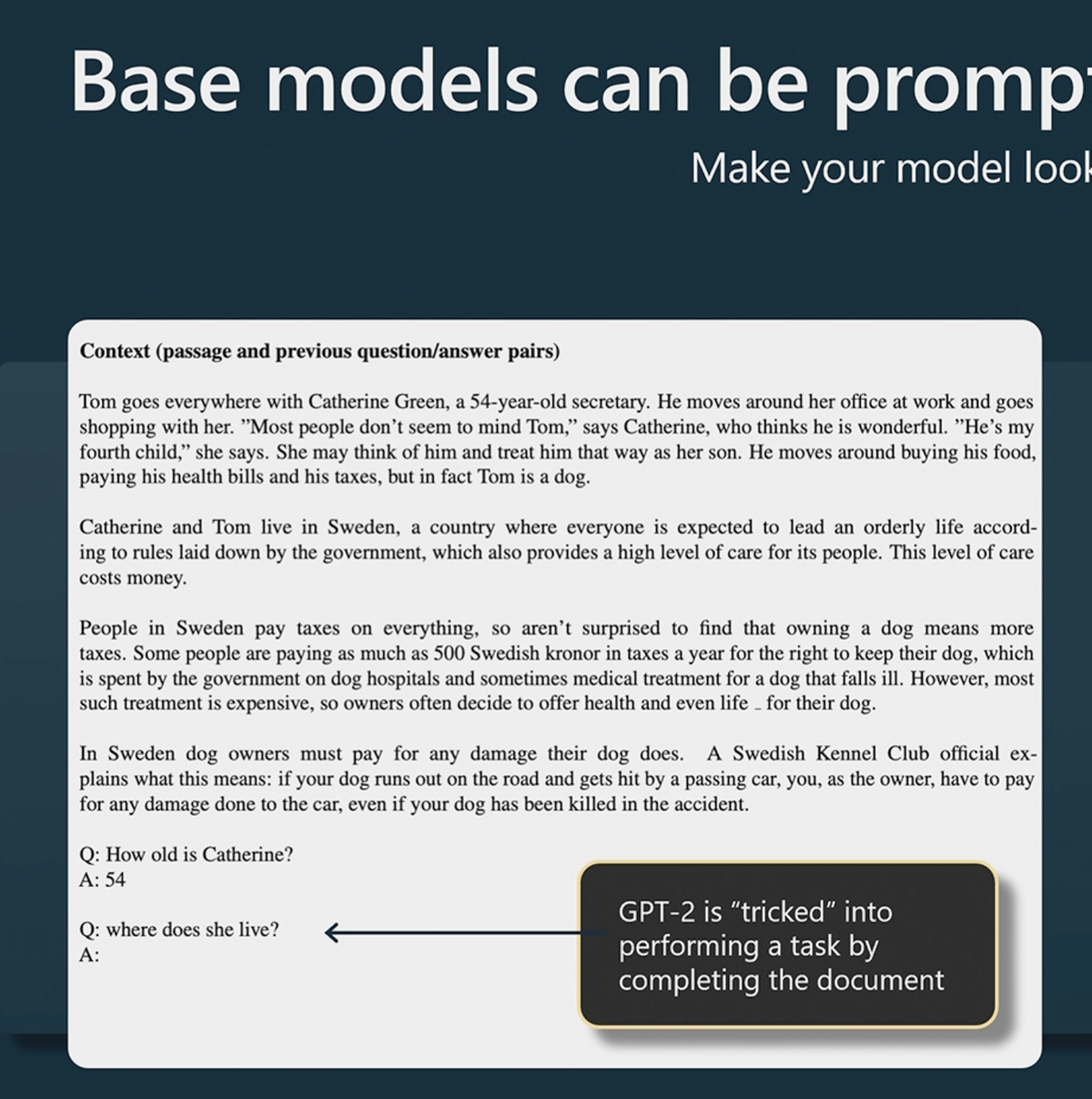 Around GPT-2, the industry noticed that if we structure out prompts in a specific way, and provide a few examples (Few Shot prompting) then the base model will be "tricked" into autocompleting what instructions we provided it in prompt.
