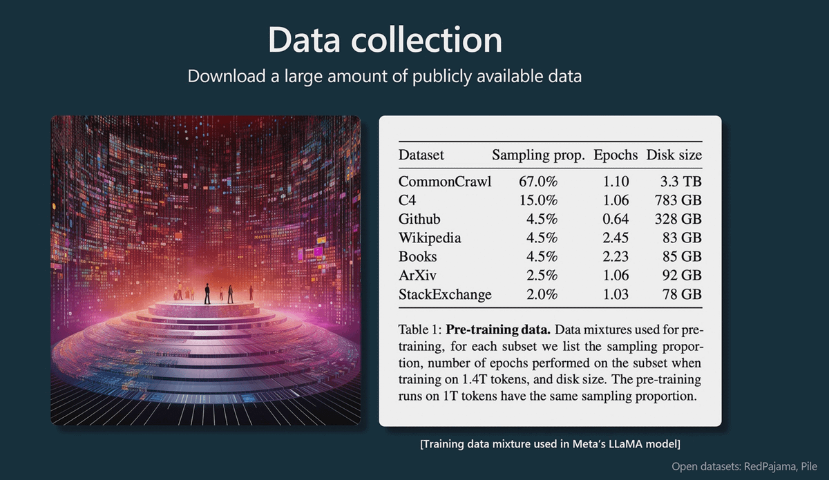 Data collection - Get tons of data from different sources (here Andrej LLaMa mixture)