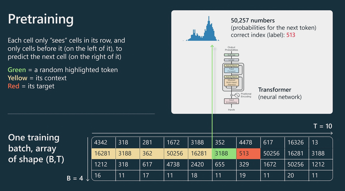 Ok STRONGLY paraphrasing here but, every iteration, the trainee model tries to predict which token/integer would come next after the green one (in image) and this is outlined by the Training curve, how well does is it able to predict the next tokens compared the original text