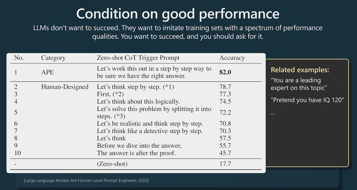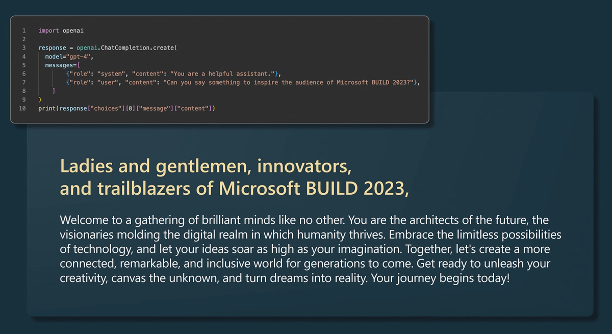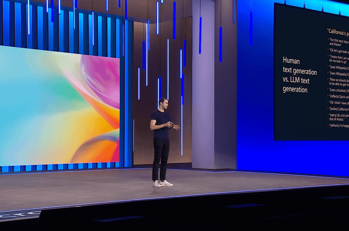 Finally, Andrej concludes with an example of how easy it is to ask for a completion, and with GPT-4 generated address to the audience of #microsoftBuild which he reads in a very TED like cadence to the applauds from the audience!