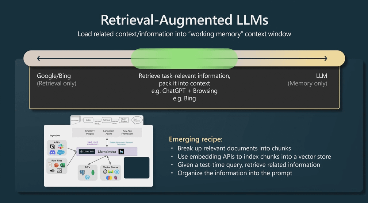 Andrej calling out @gpt_index by @jerryjliu0 on stage as an example of a way to "load" information into this perfect recall working memory.