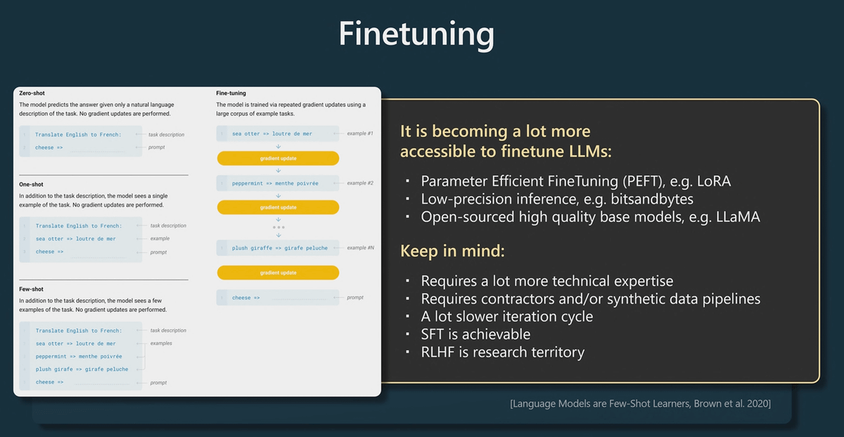 Fine-tuning changes the weights of the models. Works for smaller and open source models.