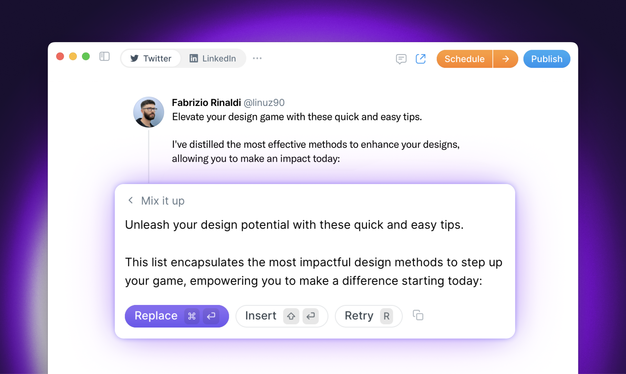 Utilize AI to rewrite and improve content. We've spent many hours tweaking our prompts to make sure they're perfect for Twitter and LinkedIn creators.