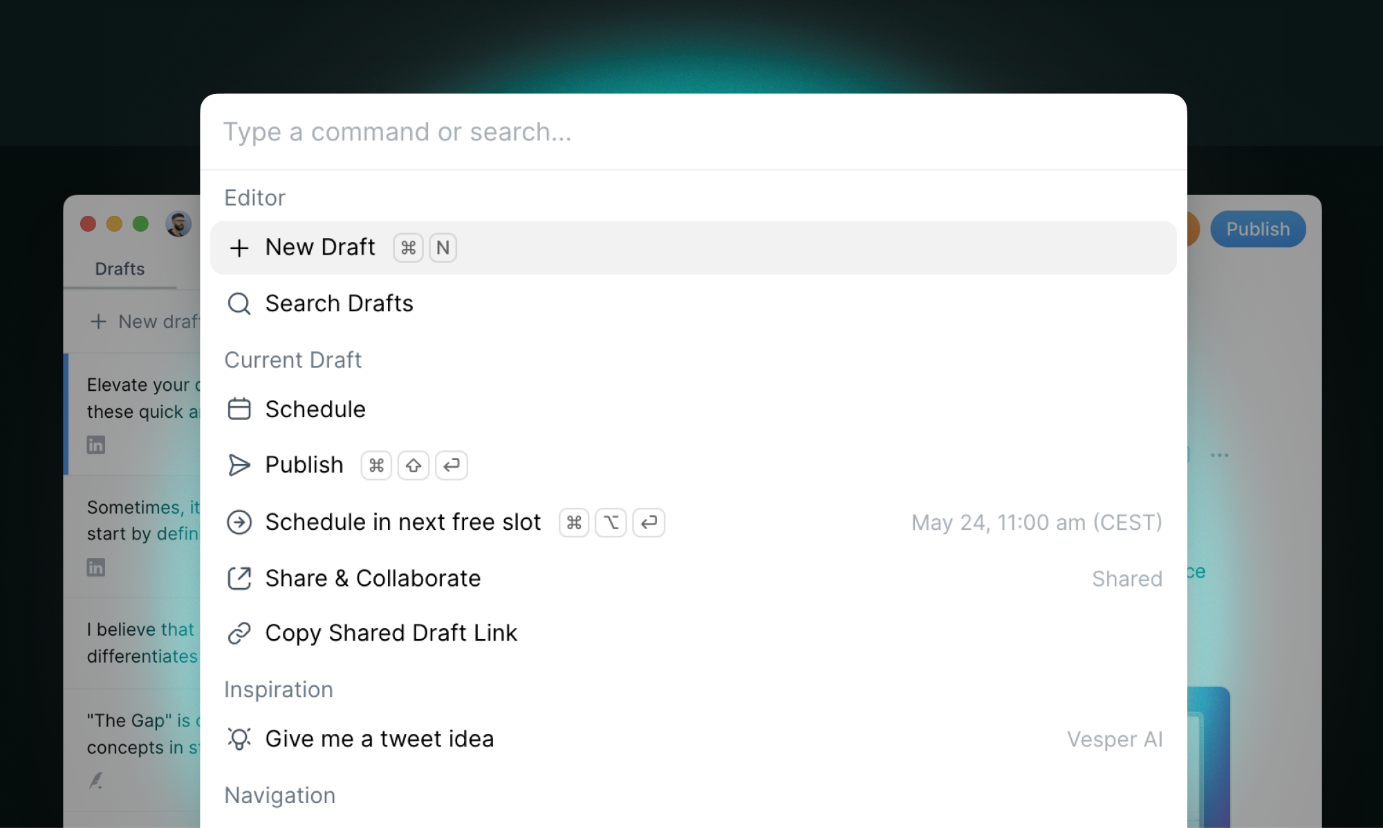 Access the CMD+K command bar to become much faster and more productive. Every Typefully feature is easily accessible this way.