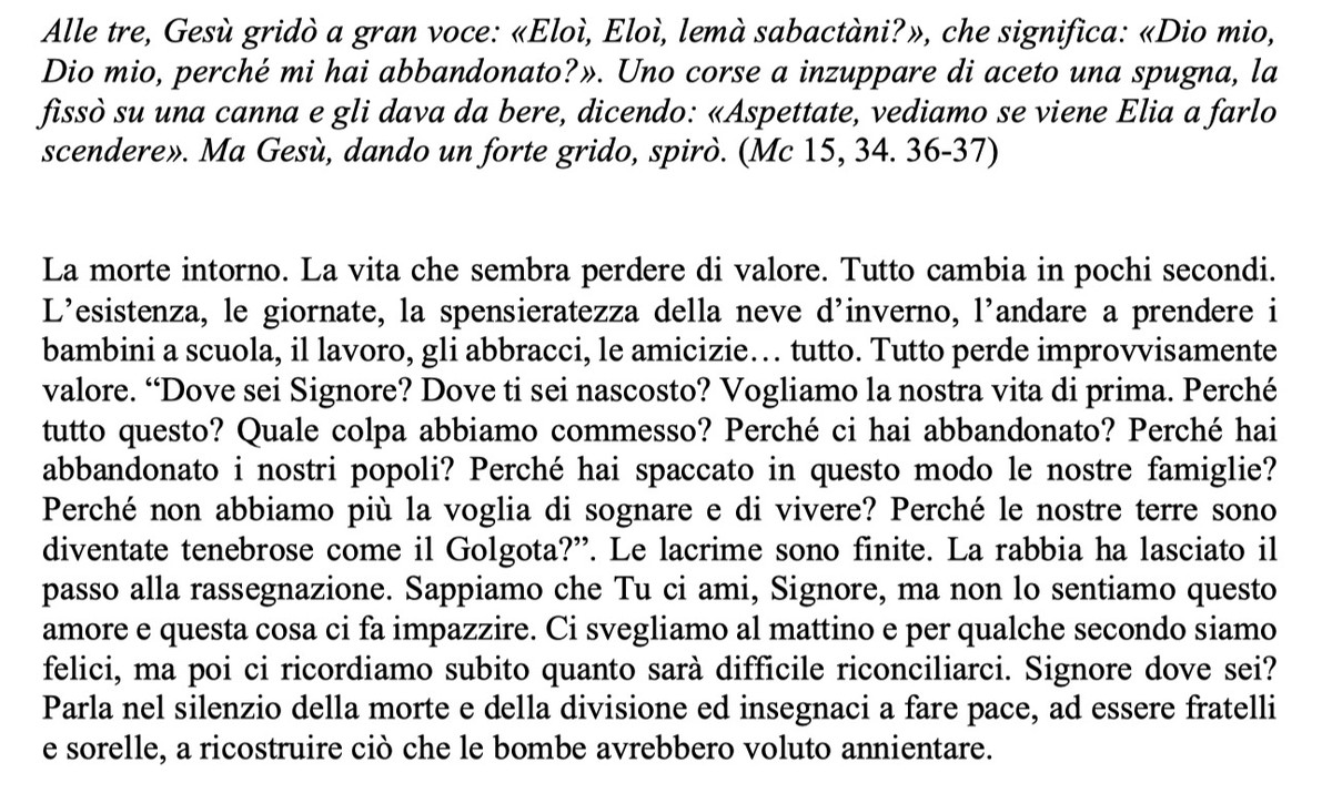 Le due donne, Albina e Irina, nel venerdì santo porteranno la Croce. Non diranno una parola. Neanche una richiesta di perdono o cose del genere. Niente. Sono sotto la Croce. Scandalosamente insieme. E’ un segno profetico mentre le tenebre sono fitte.