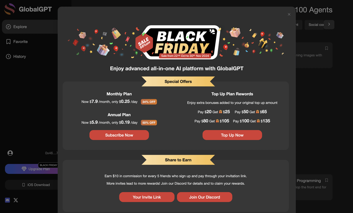 More details about @GlbGPT Black Friday event is being held here. 🎁 Special Offers Get UP TO 50% OFF! 🚀 Share to Earn Earn $$ in commission through your invitation link. More invites lead to more rewards! Visit: glbgpt.com