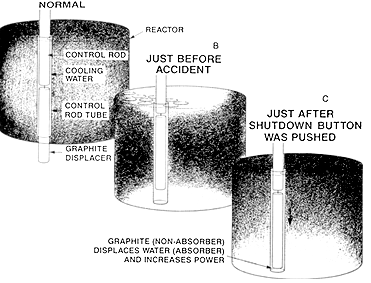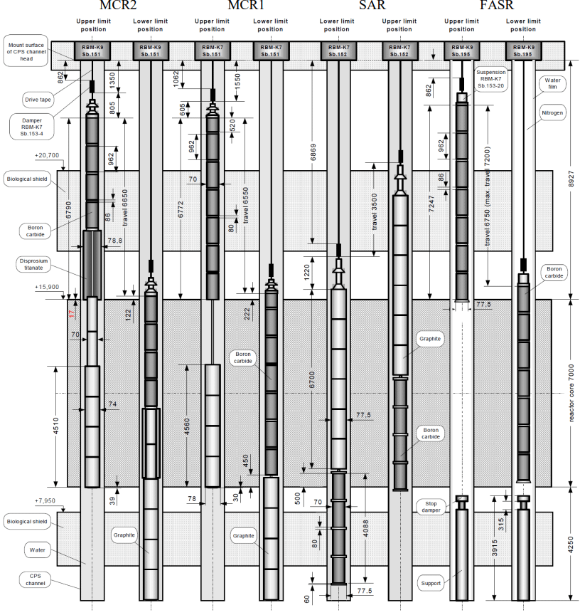 3. Incorrect construction of the control rods (MCR1 below) gives incorrect and unexpected neutron dynamics. This is also referred to as the tip effect. It was known to Soviet researchers at the time but not shared through training and operating procedures.