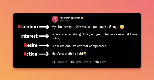 The basic idea is to write your copy to address each stage of a customer’s purchasing decision process. Here’s what AIDA stands for and how to use it in tweets: