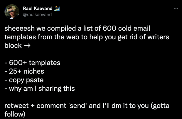 The second is the line “what am I sharing this”. Not only is this hilarious, but it also emphasises the value of his templates. Great move, Raul!