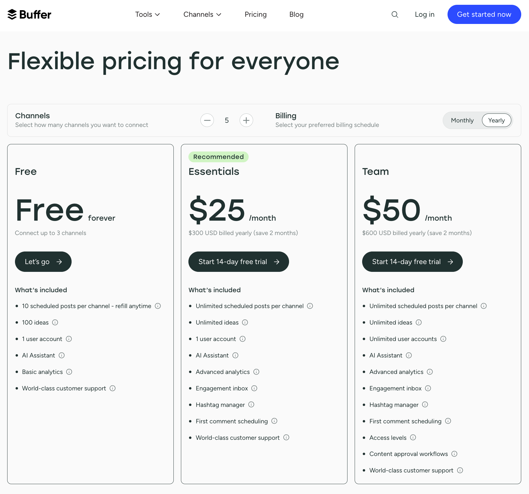While not as expensive as Hypefury or Tweethunter, for connecting 5 channels, Buffer's price is $25/month (billed annually).
