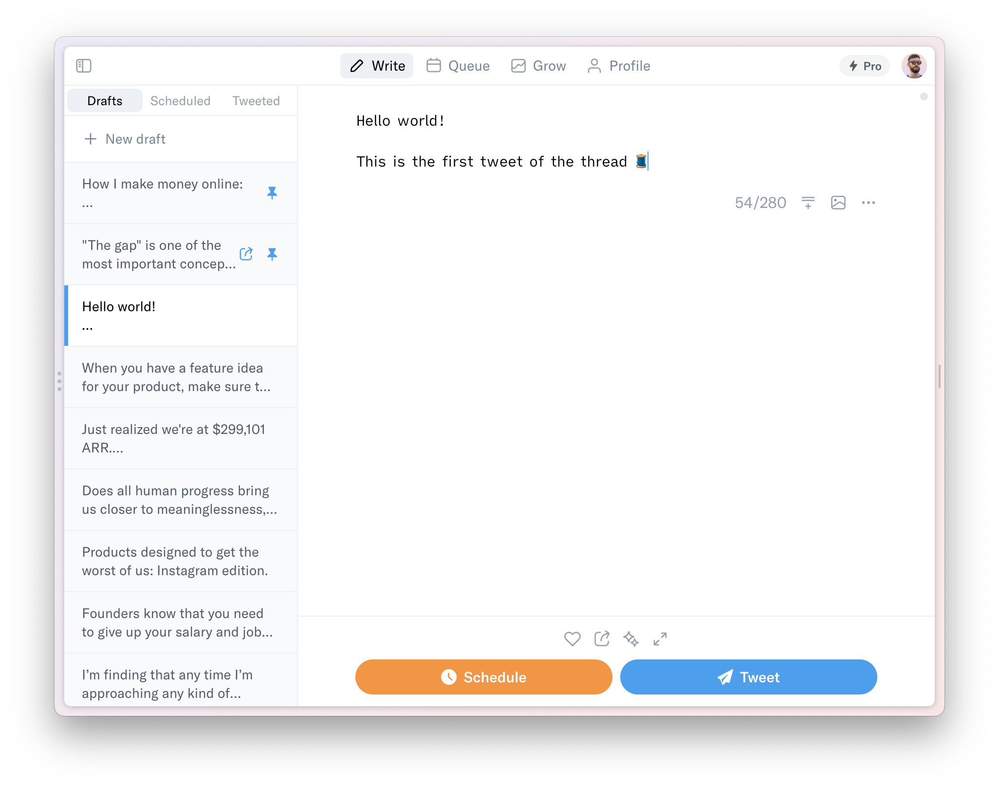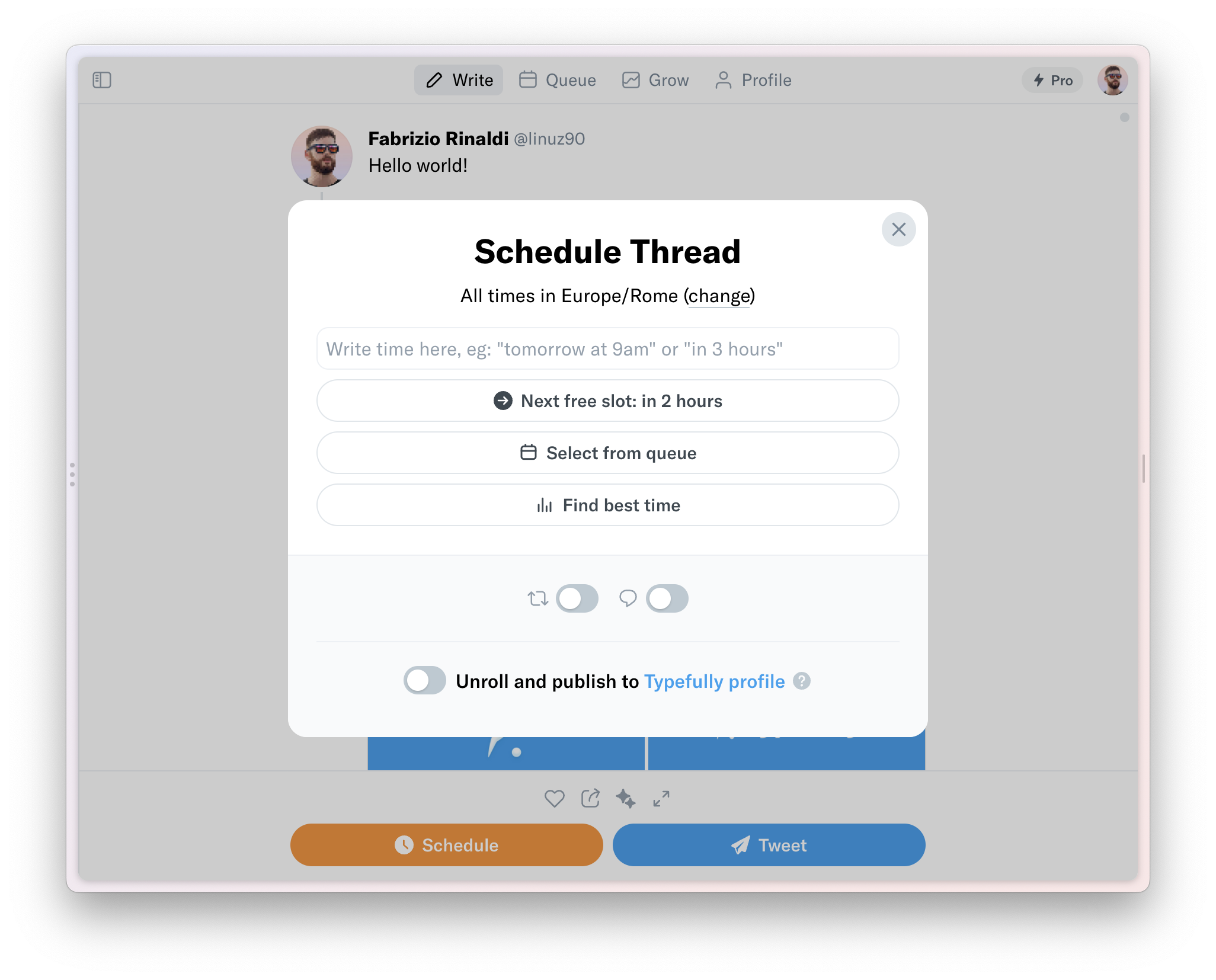 Typefully integrates with your Twitter account so that you can publish your Twitter thread immediately or have it scheduled for later posting. Users can also upgrade to Typefully pro to tap into critical data on the best times to post.