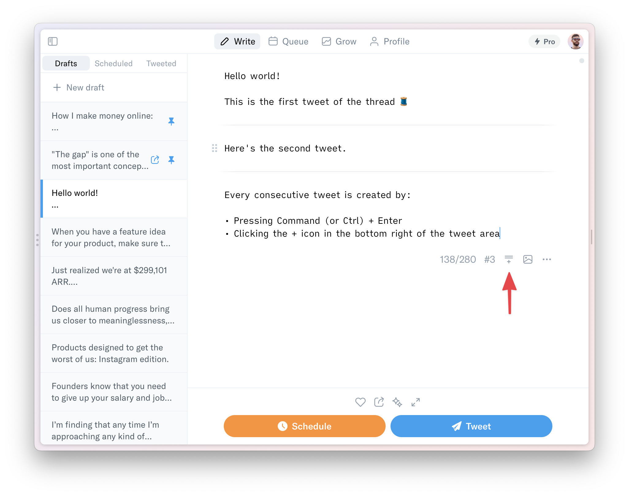 Quickly and easily write up new tweets in succession with the keyboard shortcut CMD (/CTRL) + ENTER. You will have a clear and formatted display of all your tweets in one place, so you can optimize the flow and improve clarity for the best results.