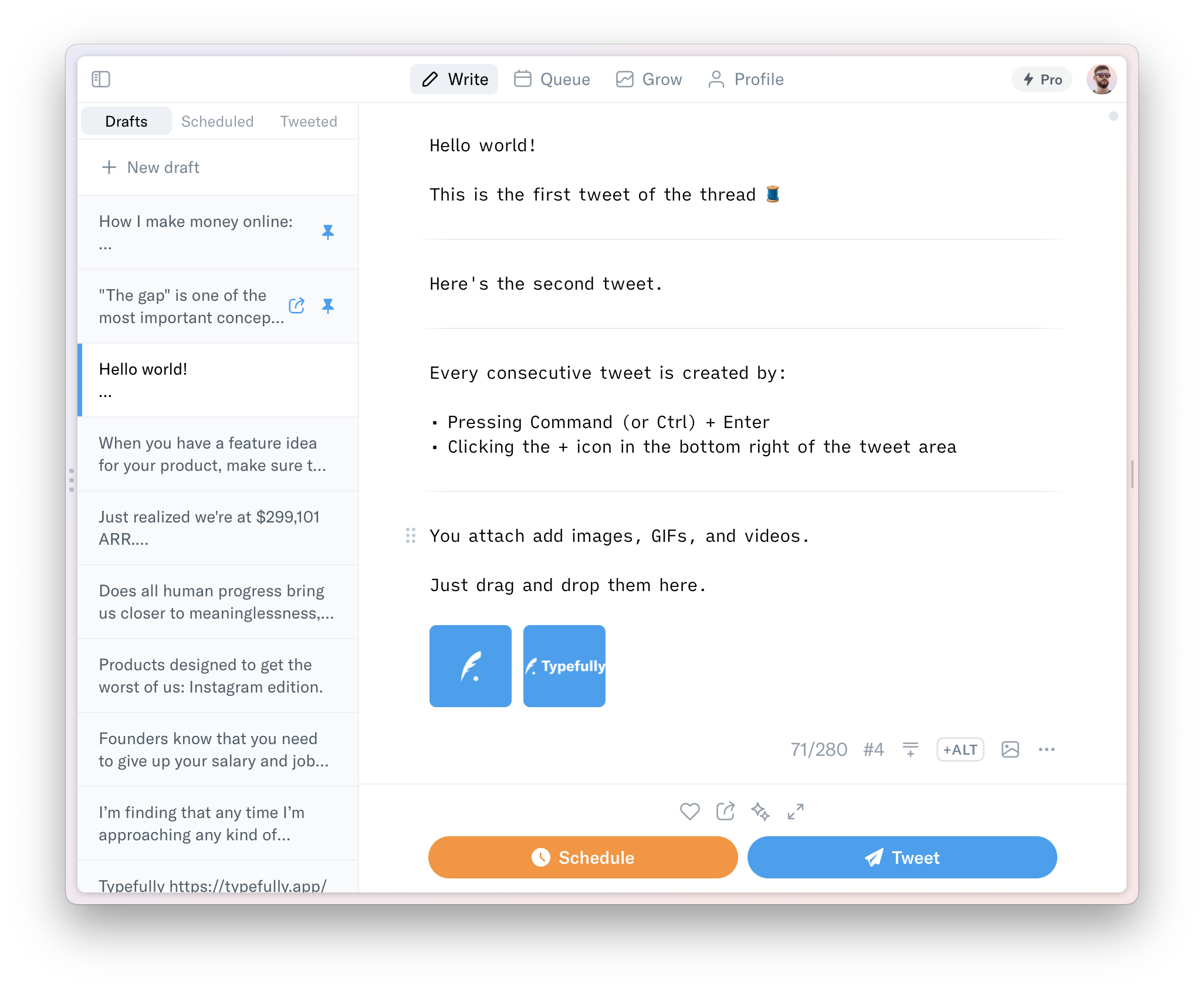 Compared to writing threads natively on Twitter (which can be a mess), Typefully is a worthwhile investment because it’s an all-in-one workspace for: