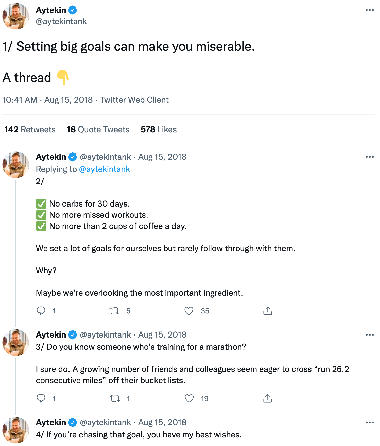 3. Tell a story. A common but effective strategy for writers, marketers, and business owners is using Twitter threads to tell a story. You can share something personal, a funny anecdote, or something industry-specific. Whatever it is, try to highlight at least one lesson or value by the end of the thread. Here’s an example thread from Andrew Wilkinson: