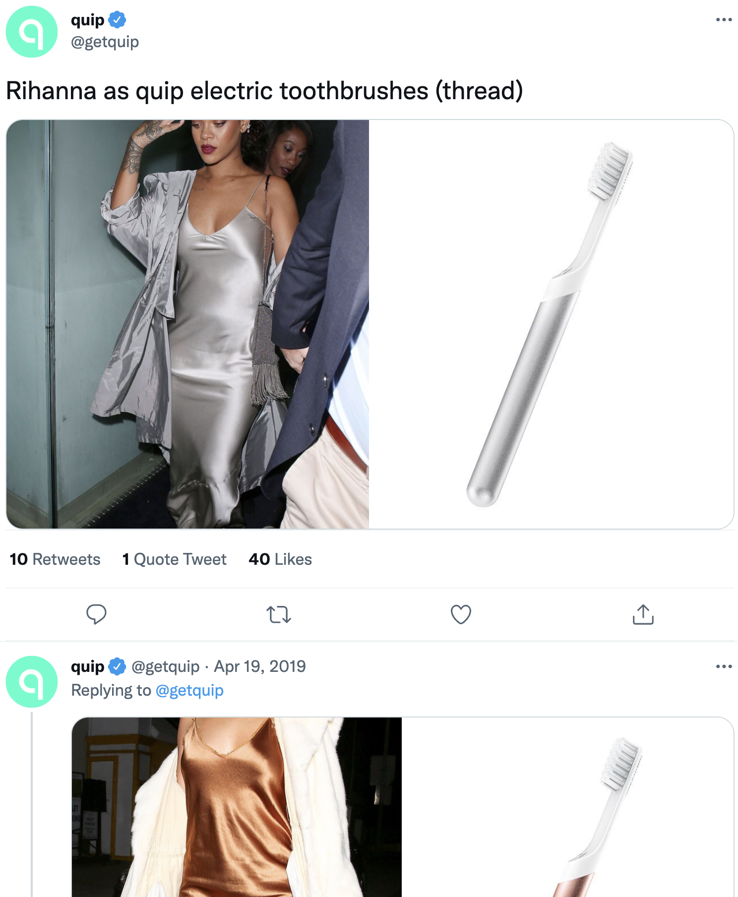 4. Hold creative marketing campaigns. You can get creative with your campaigns by ditching separate ads for once and showing off collections in a Twitter thread. You don’t always have to be so serious with professional copy and graphic design. A fun example is one by quip, who compared their electric toothbrush chromas with Rihanna’s outfits. Each additional tweet further reinforced the meme.