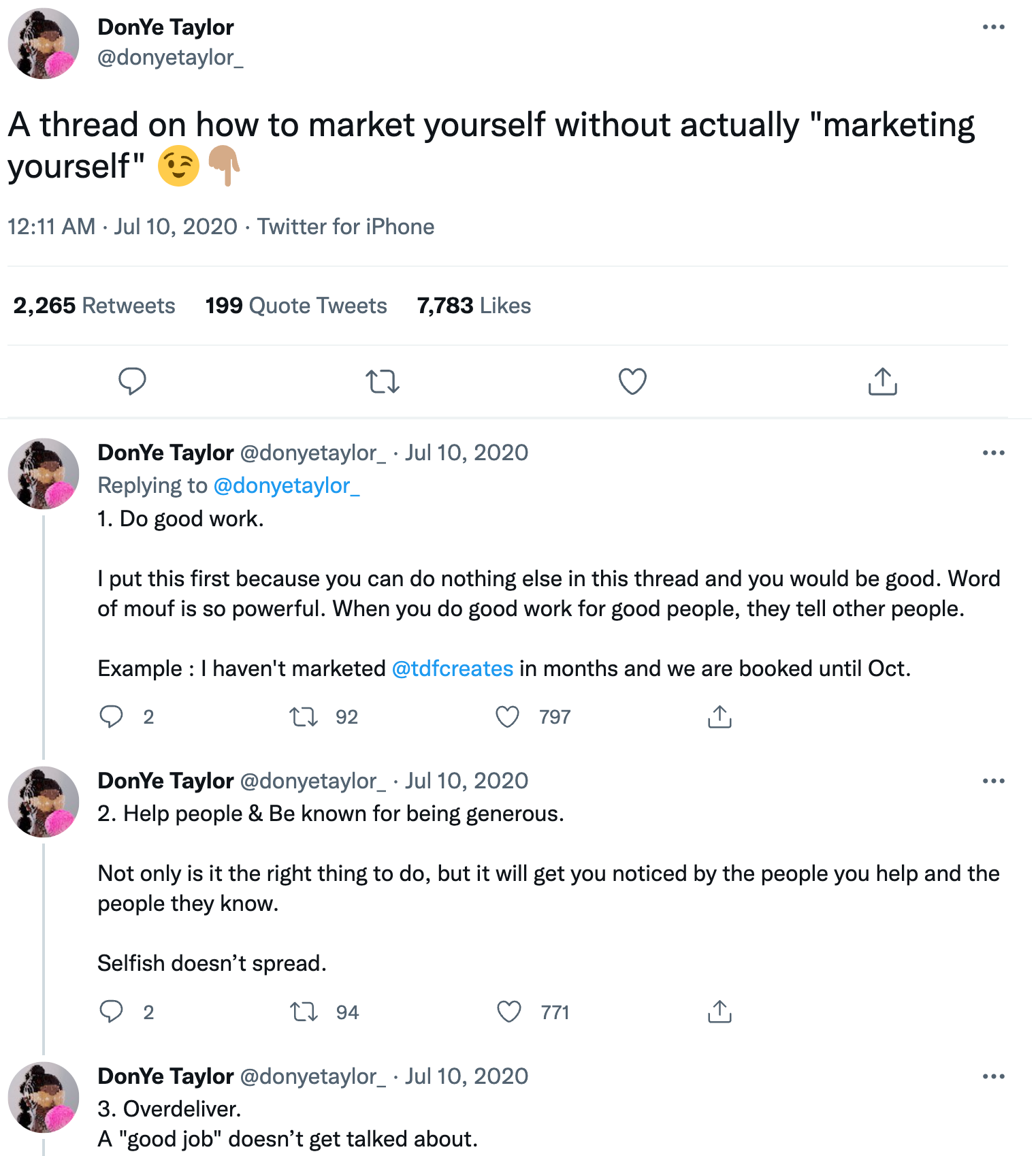 5. Do a tutorial. How-to guides are one of the most effective types of content that drive engagement, and they can go seriously viral on Twitter. Through a thread, you can show your audience how to do something without having them leave the app at all. By providing this much value so conveniently, your audience is more likely to follow for more. Take a look at how DonYe Taylor does this in a thread: