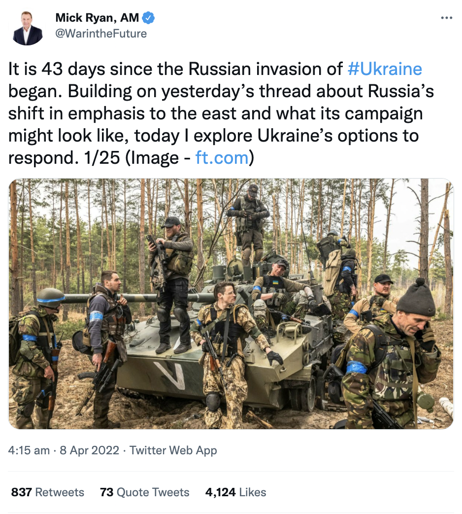 While evergreen content is some of the best for scheduling, newsworthy events can be scheduled if they’re longer lasting. For example, Mick Ryan recently posted this thread on the situation in Ukraine.