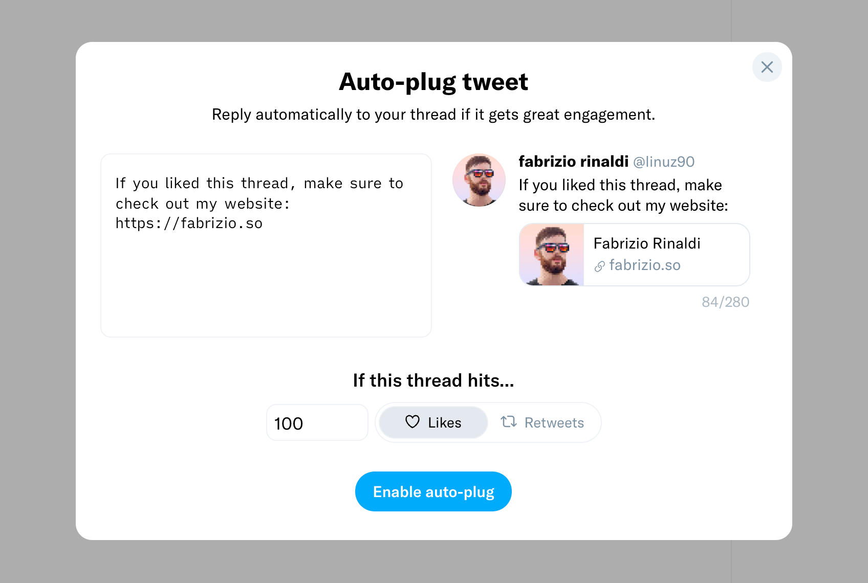 You can also choose to auto plug your tweet if Typefully notices that it gets more engagement than normal. This will automatically post a follow-up tweet of your choice, so you can send people to your SoundCloud, encourage new visitors to follow your account, or let people know about your newsletter. You can even choose how many likes or retweets are needed for it to auto plug the tweet.