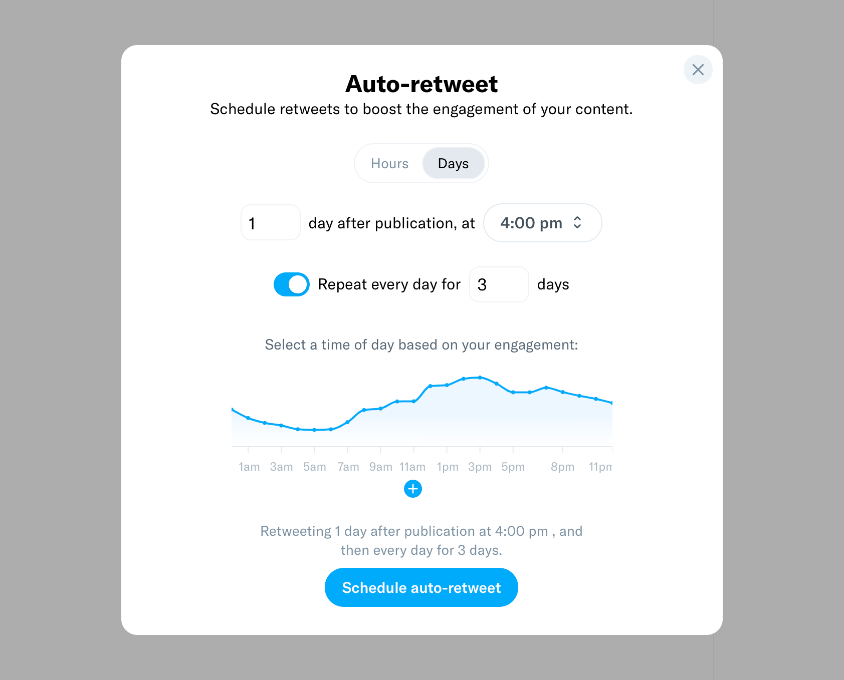 You can choose to auto retweet your thread after a certain amount of time has elapsed, ensuring your followers don’t miss your best posts.